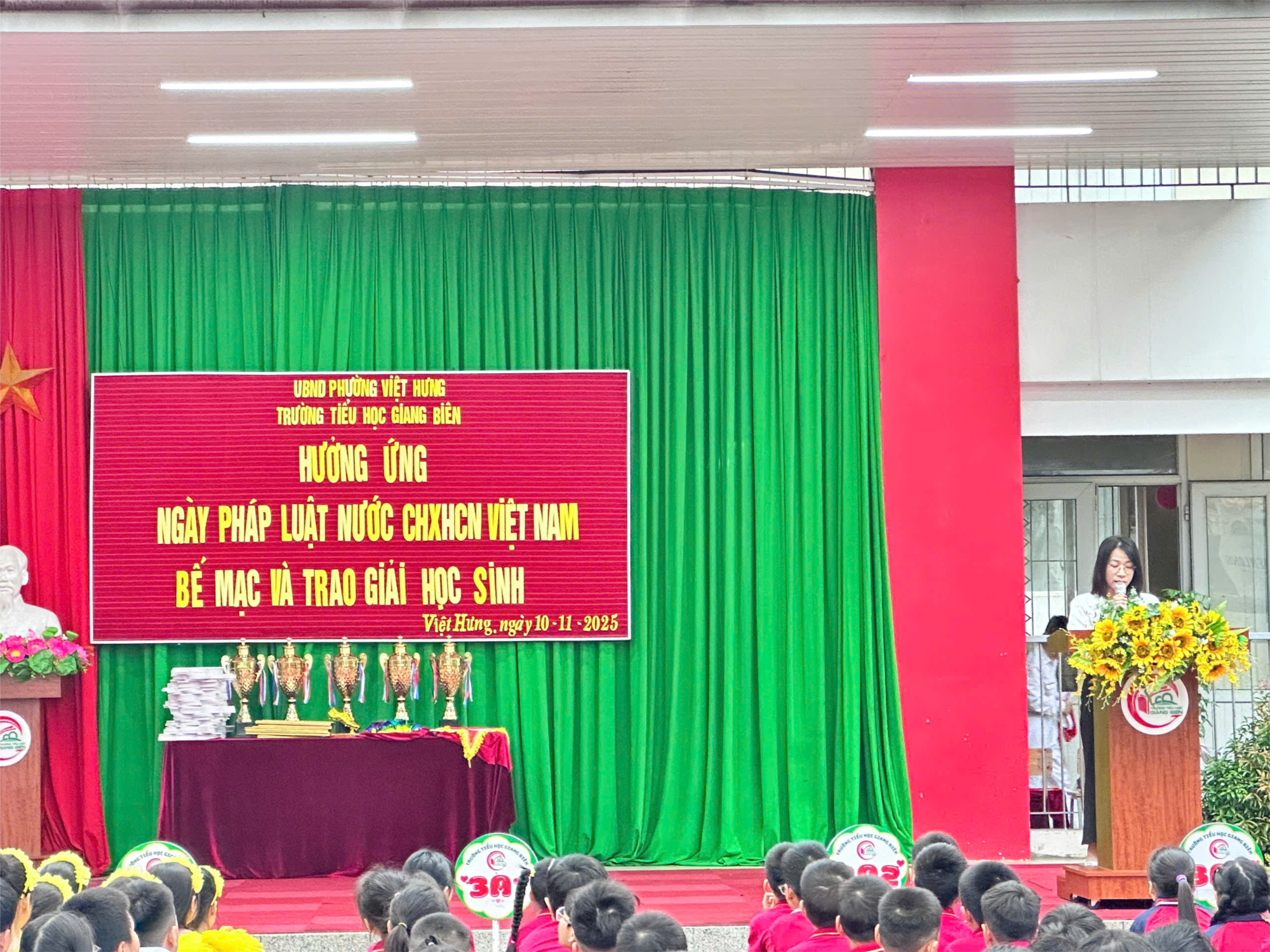 Hưởng ứng “Ngày Pháp luật nước Cộng hòa xã hội chủ nghĩa Việt Nam” (9/11) – ngày có ý nghĩa đặc biệt nhằm tôn vinh Hiến pháp và pháp luật, nâng cao ý thức thượng tôn pháp luật trong toàn xã hội – sáng thứ Hai, ngày 10 tháng 11 năm 2025, Liên đội Trường Tiểu học Giang Biên tổ chức buổi sinh hoạt dưới cờ tuần 10 với chủ đề: “Tuyên truyền pháp luật nước Cộng hòa xã hội chủ nghĩa Việt Nam”.