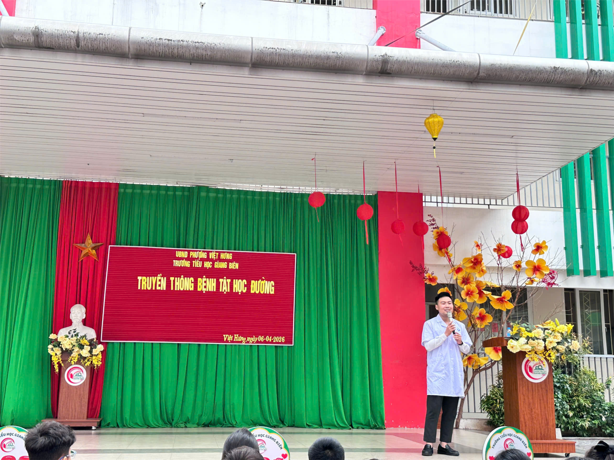Nhằm nâng cao nhận thức và trang bị cho học sinh những kiến thức cần thiết trong việc bảo vệ sức khỏe, sáng ngày 6/4/2026, trong tiết Sinh hoạt dưới cờ, Trường Tiểu học Giang Biên đã tổ chức buổi tuyên truyền về chăm sóc sức khỏe học đường. Buổi tuyên truyền do bác sĩ Lưu Anh Đức – Khoa Phòng bệnh, Trạm Y tế phường Việt Hưng trực tiếp chia sẻ, thu hút sự tham gia đông đủ của cán bộ, giáo viên và toàn thể học sinh trong nhà trường.