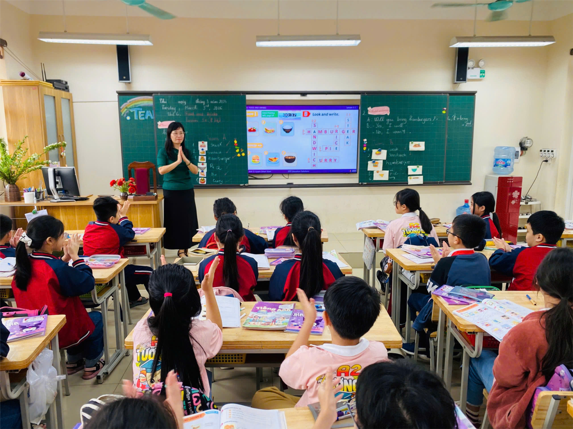 Không khí lớp học sôi nổi ngay từ những phút khởi động đầu giờ. Các em được ôn tập từ vựng về đồ ăn, thức uống qua trò chơi tương tác thú vị. Phần trọng tâm của tiết học là hoạt động lên kế hoạch chuẩn bị đồ ăn, thức uống cho một buổi dã ngoại. Học sinh làm việc theo nhóm, cùng thảo luận và đưa ra danh sách phù hợp. Nhiều ý tưởng sáng tạo được các em mạnh dạn chia sẻ bằng tiếng Anh. Các nhóm tự tin trình bày kế hoạch trước lớp với phong thái tự nhiên, vui tươi. Cô giáo luôn khích lệ, hỗ trợ để mọi học sinh đều được tham gia. Tiết học diễn ra nhẹ nhàng nhưng hiệu quả. Các em ham hoạt động, tương tác tốt và phối hợp nhịp nhàng. Khả năng giao tiếp tiếng Anh của học sinh được phát huy rõ rệt. Không khí lớp học tràn ngập tiếng cười và sự hào hứng.
