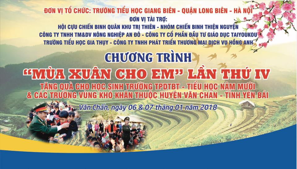 Nhân dịp năm mới và chuẩn bị đón Tết Mậu Tuất 2018, Trường Tiểu học Giang Biên tổ chức chương trình "Mùa xuân Cho Em lần thứ IV"; thăm và tặng quà cho đơn vị kết nghĩa: Trường PTDTBT - Tiểu học Nậm Mười và một số trường khó khăn thuộc địa bàn huyện Văn Chấn - Tỉnh Yên Bái vào ngày 06/01/2018.
